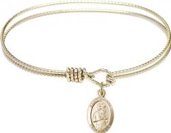 Saint Gianna Gold-Plated Textured Metal Oval-Eye Hook Bangle with Saint Gianna 1/10 - 14k Yellow Harmony Gold-Filled Medal [1/2-inch x 1/4-inch wide]. Bracelet Size 6.25 inches. Made in USA. Touched to Saint Gianna's Second-Class Relic before shipping. Tan Gift Box.