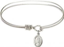Saint Gianna Rhodium-Plated Textured Metal Oval-Eye Hook Bangle with Saint Gianna Silver-Plated Medal [1/2-inch x 1/4-inch wide]. Bracelet Size 7.25 inches. Made in USA. Touched to Saint Gianna's Second-Class Relic before shipping. Tan Gift Box.
