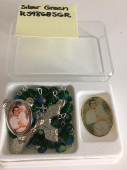 Saint Gianna Beretta Molla 7mm Green Crystal Rosary Bead with silver-tone Saint Gianna Beretta Molla 1-1/4-inch x ½-inch resin centerpiece (Saint Gianna is holding daughter, Mariolina), with silver-tone 2-inch deluxe cross; rosary is 17-inches in length. Gift box includes 1-in x 3/4-in lapel resin gold-tone pin. Made in Italy. Items in gift set are touched to Saint Gianna's Second-Class Relic prior to shipping to customer. R598GBSGR