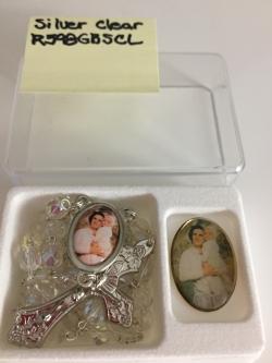 Saint Gianna Beretta Molla 7mm Clear Crystal Rosary Bead with silver-tone Saint Gianna Beretta Molla 1-1/4-inch x ½-inch resin centerpiece (Saint Gianna is holding daughter, Mariolina), with silver-tone 2-inch deluxe cross; rosary is 17-inches in length. Gift box includes 1-in x 3/4-in lapel resin gold-tone pin. Made in Italy. Items in gift set are touched to Saint Gianna's Second-Class Relic prior to shipping to customer. R598GBSCL