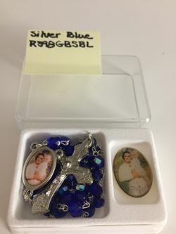 Saint Gianna Beretta Molla 7mm Blue Crystal Rosary Bead with silver-tone Saint Gianna Beretta Molla 1-1/4-inch x ½-inch resin centerpiece (Saint Gianna is holding daughter, Mariolina), with silver-tone 2-inch deluxe cross; rosary is 17-inches in length. Gift box includes 1-in x 3/4-in lapel resin gold-tone pin. Made in Italy. Items in gift set are touched to Saint Gianna's Second-Class Relic prior to shipping to customer. R598GBSBL