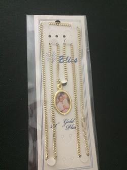 Gold-tone Picture medal of Saint Gianna holding daughter, Mariolina, (1"L x 3/4"W) Made in Italy on 24-inch heavy curb gold-plated chain 2.90mm with lobster claw clasp. Item will be touched to Saint Gianna's Second-Class relic before shipping.