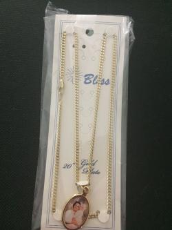 Gold-tone Picture medal of Saint Gianna holding daughter, Mariolina, (1"L x 3/4"W) Made in Italy on 20-inch heavy curb gold-plated chain 2.90mm with lobster claw clasp. Item will be touched to Saint Gianna's Second-Class relic before shipping.